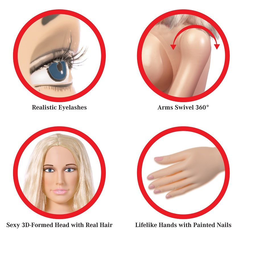 Diese unglaubliche aufblasbare Liebespuppe in Lebensgröße wurde sorgfältig mit realistischen Merkmalen für ein wirklich lebensechtes Erlebnis entworfen. Ihr sexy 3-D-Kopf hat realistische Wimpern und einen luxuriösen Kopf aus echtem Haar, der zum Ziehen bettelt! Beobachten Sie, wie sie mit um 360 Grad drehbaren Armen und wunderschön bemalten Fingern und Zehennägeln zum Leben erweckt wird. Geben Sie ihren festen und frechen Brüsten einen Druck, während Sie ihre ultra-naturgetreue Fanta-Flesh ? Haut, Muschi und ihren Arsch genießen, die sich noch besser anfühlen als das Original! Die Fanta-Flesh ? Muschi und der Arsch sind für eine gründliche Reinigung abnehmbar und können sogar separat zum Masturbieren genossen werden. Eine Aufpumppumpe, ein Vinylreparaturset und Anweisungen sind bequem enthalten.